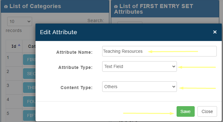 Attributes are the actual contents for the lesson plan template. These attributes are added to each of the categories previously created.