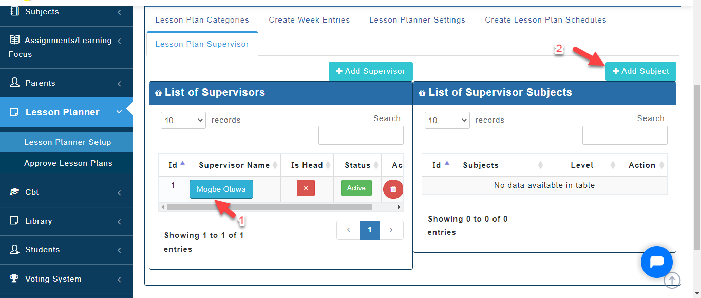 - After creating Supervisors, Click on the Name of the Staff you want to Add Subjects for. A tab will appear, Click on Add Subjects