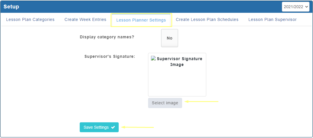 Categories, weekly setup, settings, lesson plan schedule, lesson plan supervisor