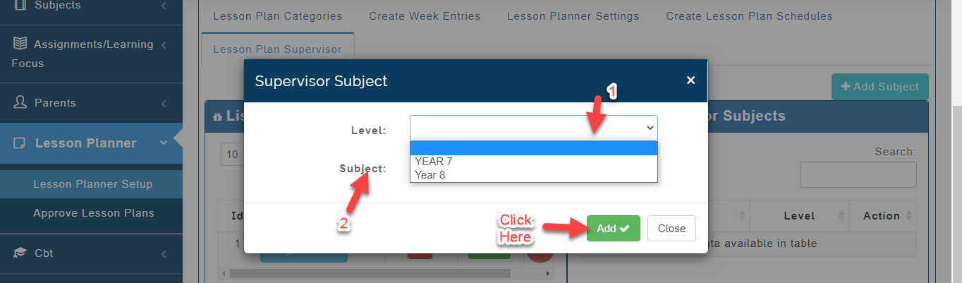- A Modal will appear, Select the Level and the Subject the person Supervises Lesson plan for. Click on Add.