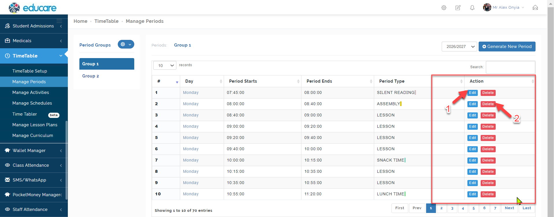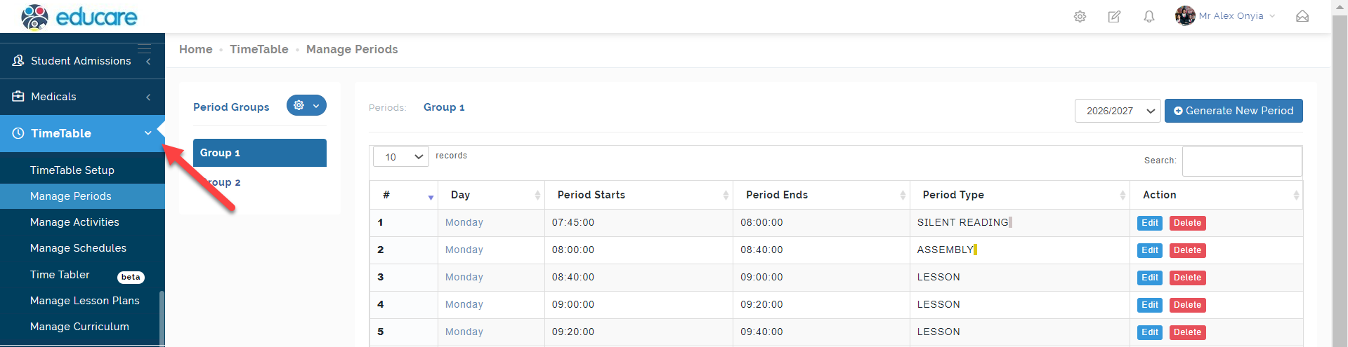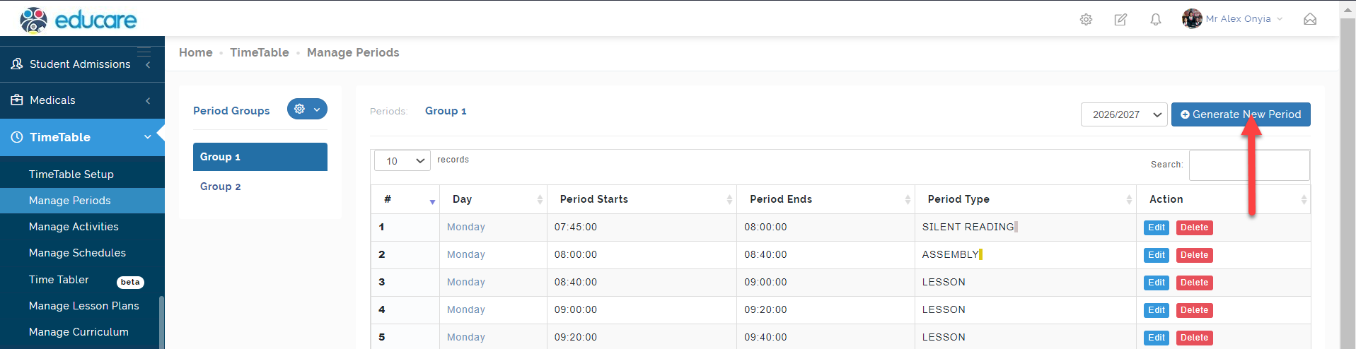 Select manage periods this opens up the page where you can add periods, edit periods and delete existing periods.