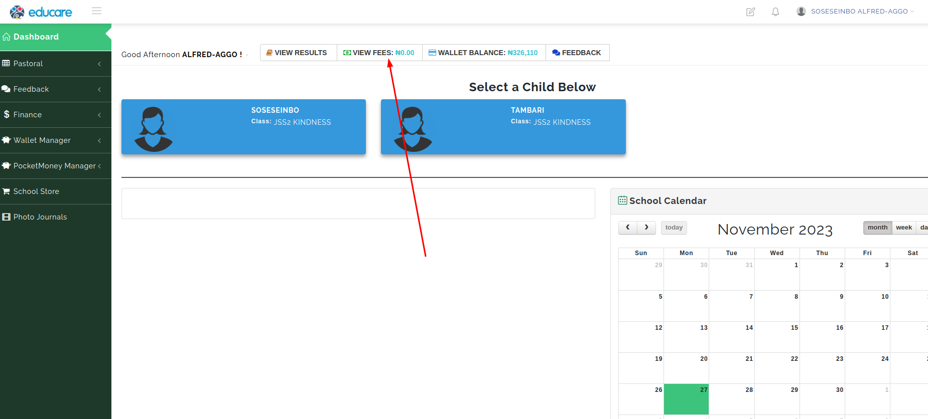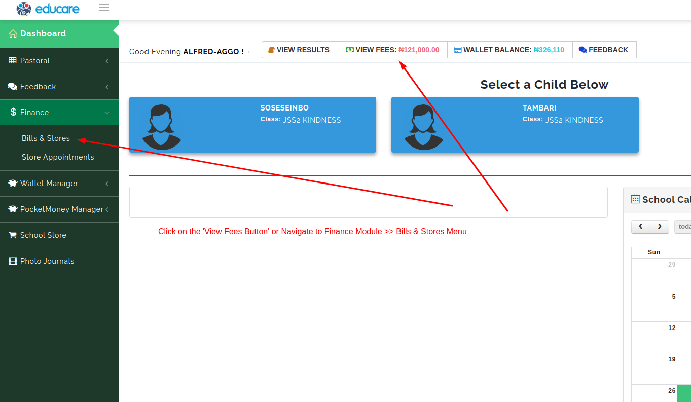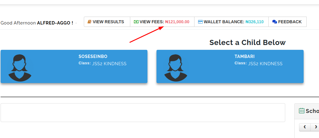 Once you have successfully logged in as a parent using your email address and password, you should see the 'View Fees' button at the top of your dashboard.The view fees button leads to the bills and invoices that have been generated for your child(ren). (See the picture below)