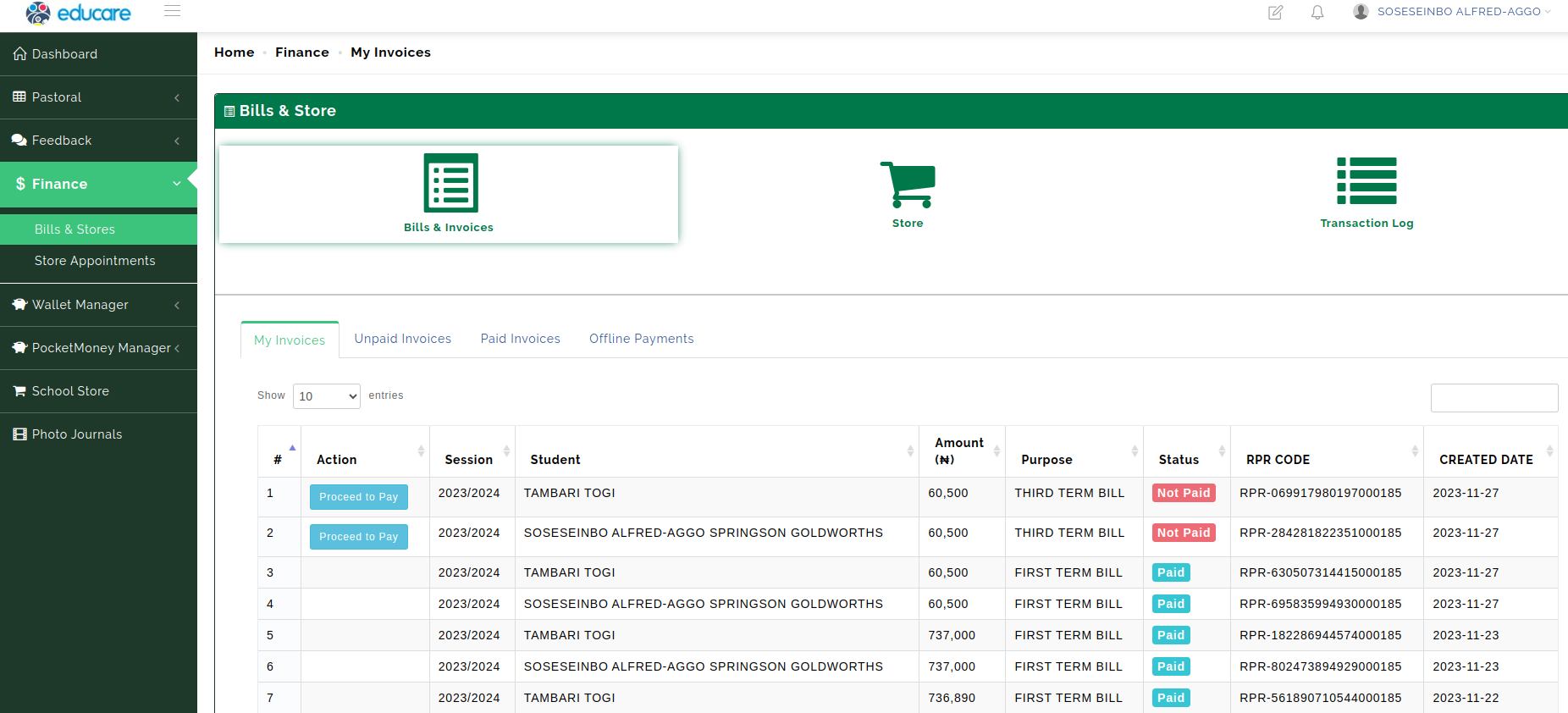 You can also get to the same page via the Finance Menu Finance >> Bills & Stores (see picture below)