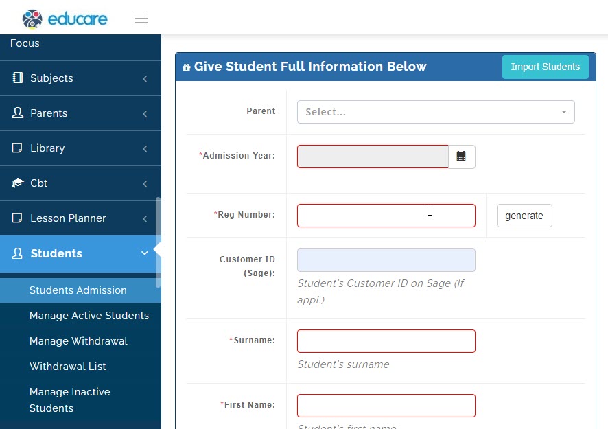 Here the admin staff (registrar) or any staff in charge of admitting students into your school can easily create a student profile for your school.