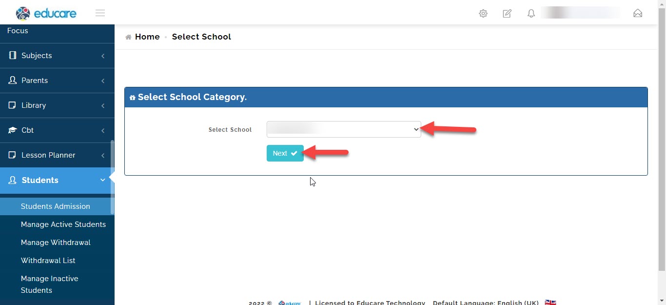 select the school (if your school has different arms like eyfs, junior school or high school) and click next.